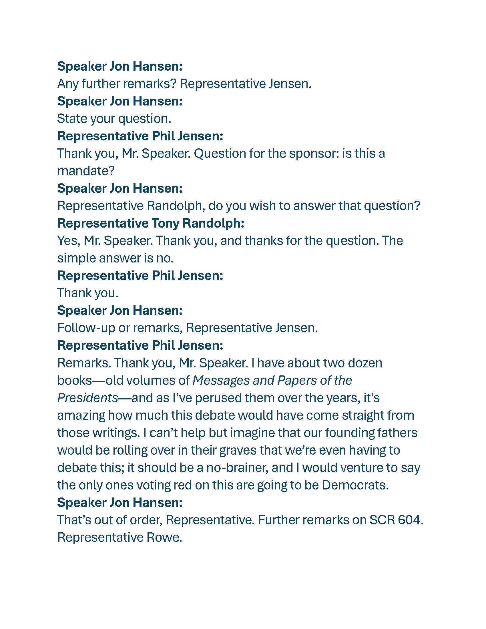A point of order was then raised by a member of the Democratic caucus objecting to that statement. The Speaker ruled Rep. Jensen out of order, as reflected in the official House Journal.